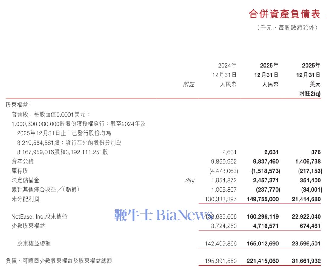截至2025年12月31日,网易股东权益总额为1650亿元(约236亿美元)。(转载自雷递)