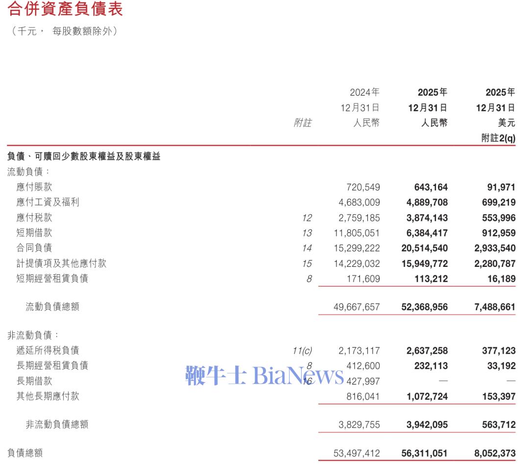 截至2025年12月31日,网易负债总额为563亿(约80.5亿美元),其中,流动负债总额为523.68亿(约74.89亿美元),非流动负债为39.42亿(约5.64亿美元)。