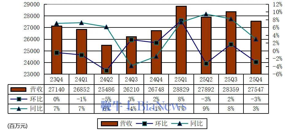 其中,网易2025年第四季度营收为275亿元(约39亿美元),较上年同期的267亿元增长3%,较上一季度的284亿元下降3%。