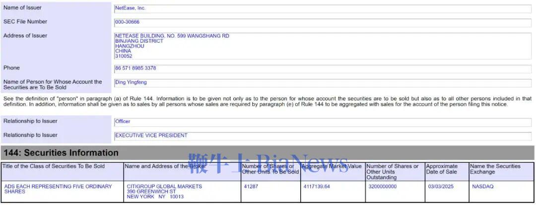 据网易递交给美国SEC的文件显示,网易执行副总裁丁迎峰于2025年3月3日减持41287股,套现411.71万美元(约3001万元)。